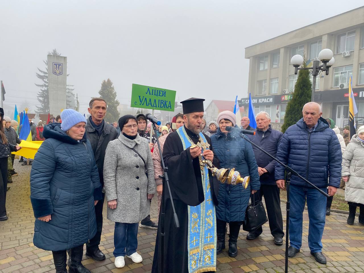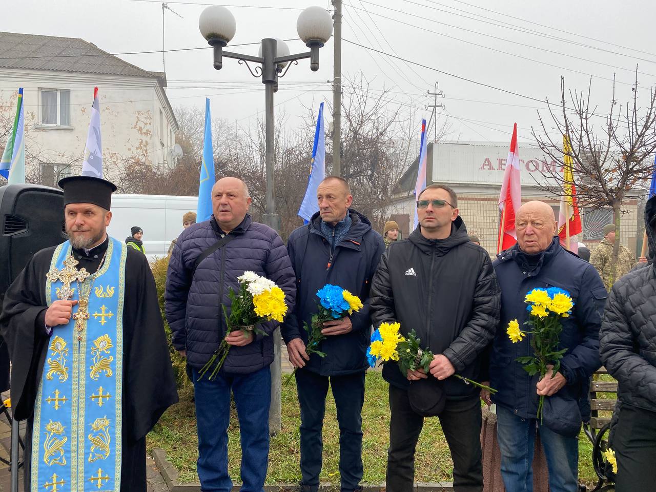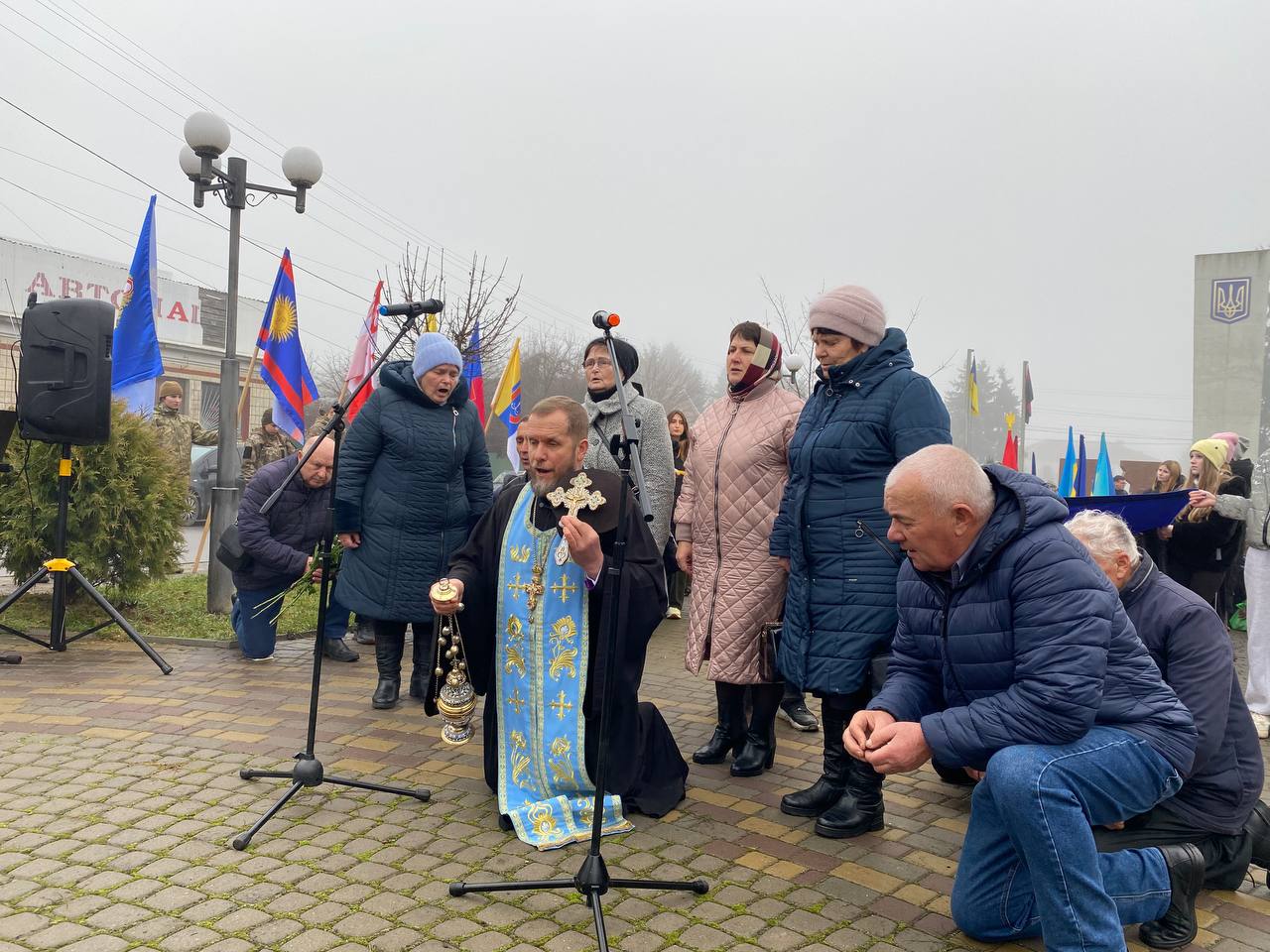 Біля пам’ятного знаку благочинний храмів Хмільницького району протоієрей Іван Пукас разом із присутніми звершив спільну молитву за Україну, її захисників та всіх борців за свободу й незалежність.
