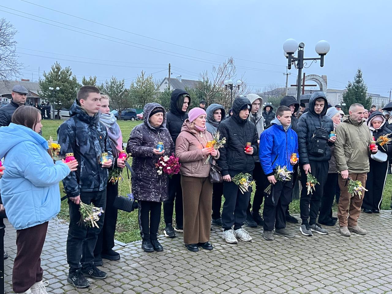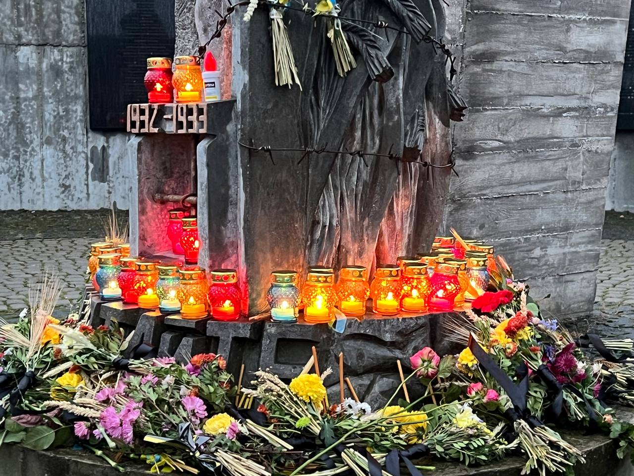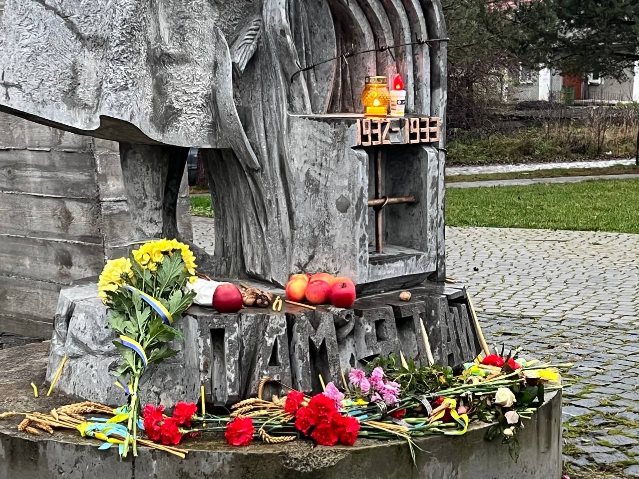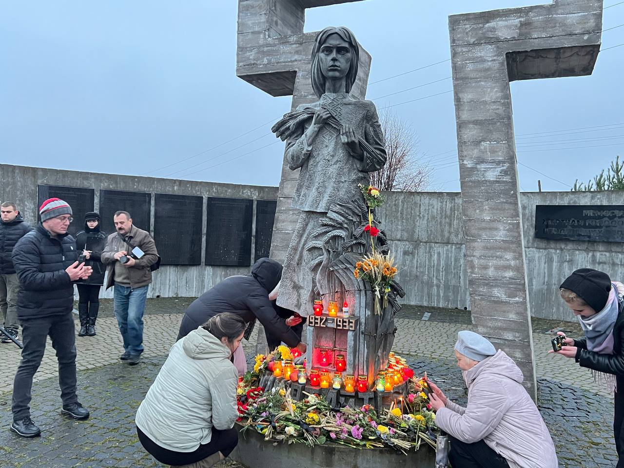 На знак глибокої скорботи та пам'яті про заморених голодом українців хмільничани запалили лампадки та поклали до меморіального хреста букети з колоссям пшениці та живими квітами.