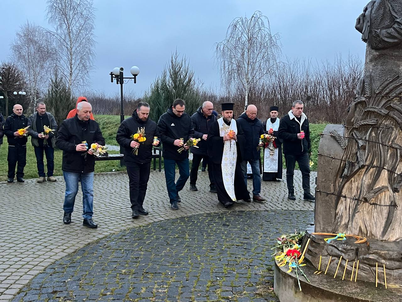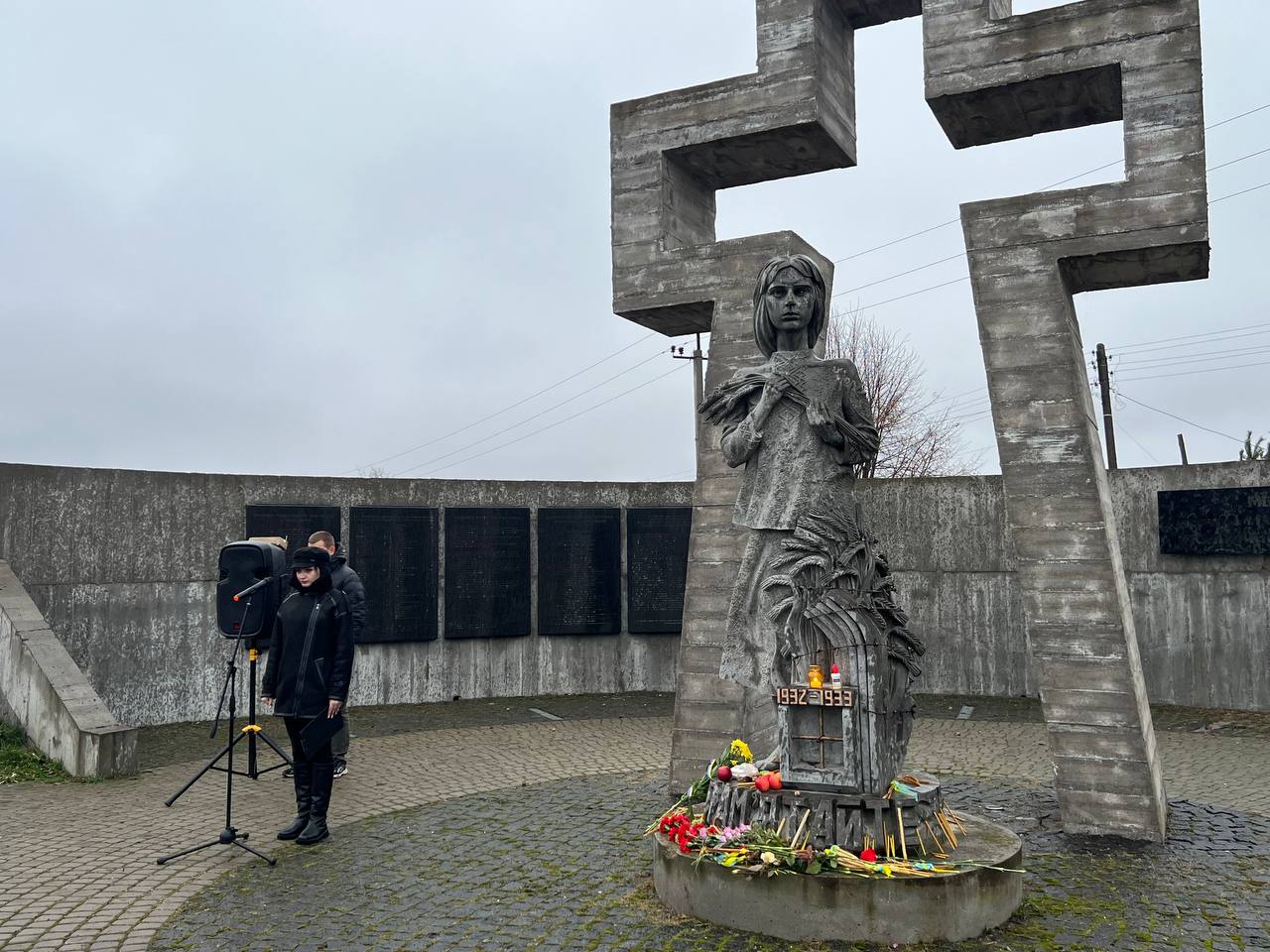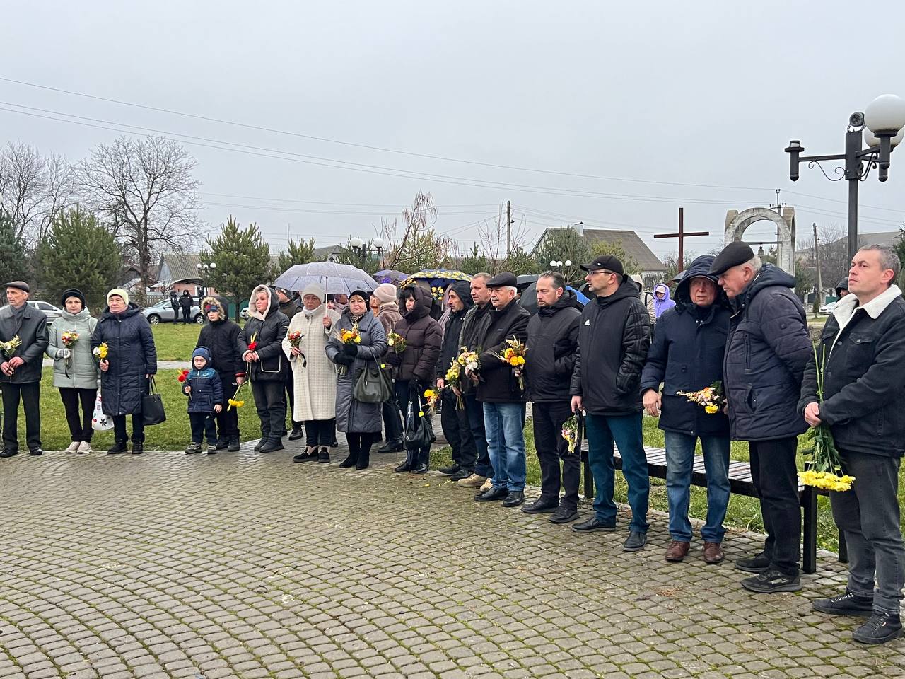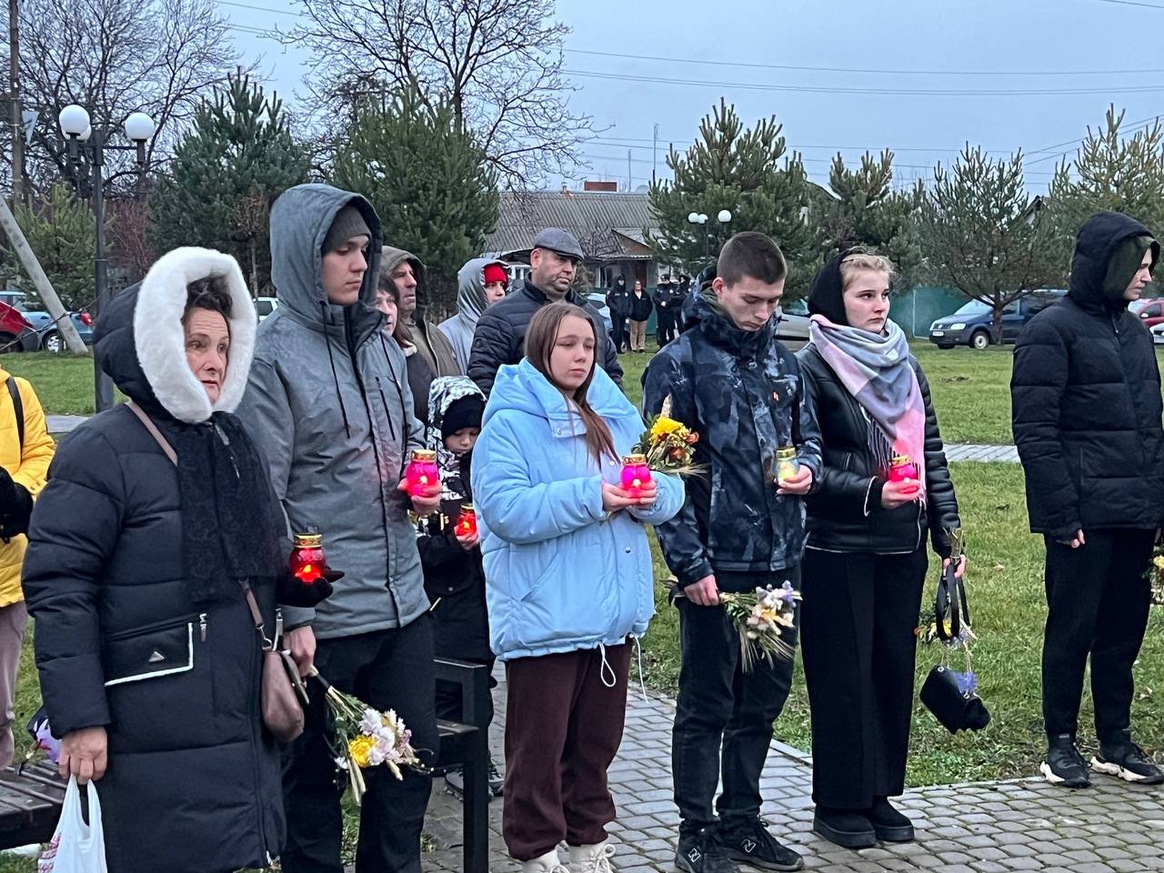 На знак глибокої скорботи та пам'яті про заморених голодом українців хмільничани запалили лампадки та поклали до меморіального хреста букети з колоссям пшениці та живими квітами.