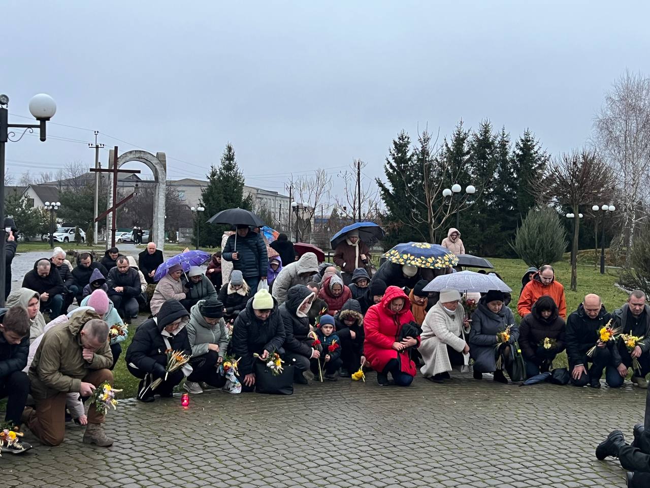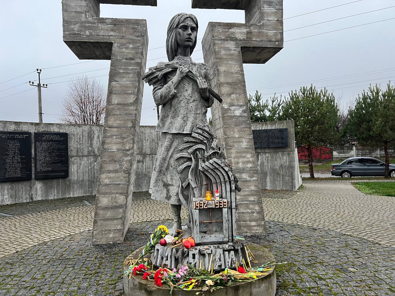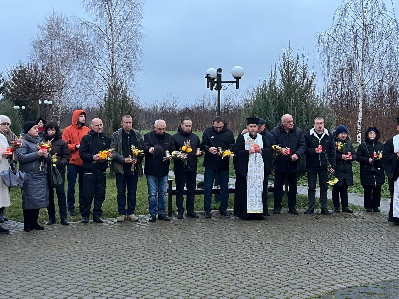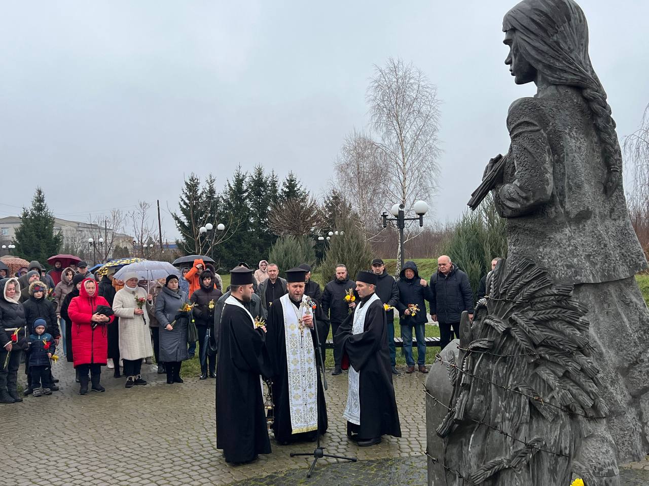 На знак глибокої скорботи та пам'яті про заморених голодом українців хмільничани запалили лампадки та поклали до меморіального хреста букети з колоссям пшениці та живими квітами.