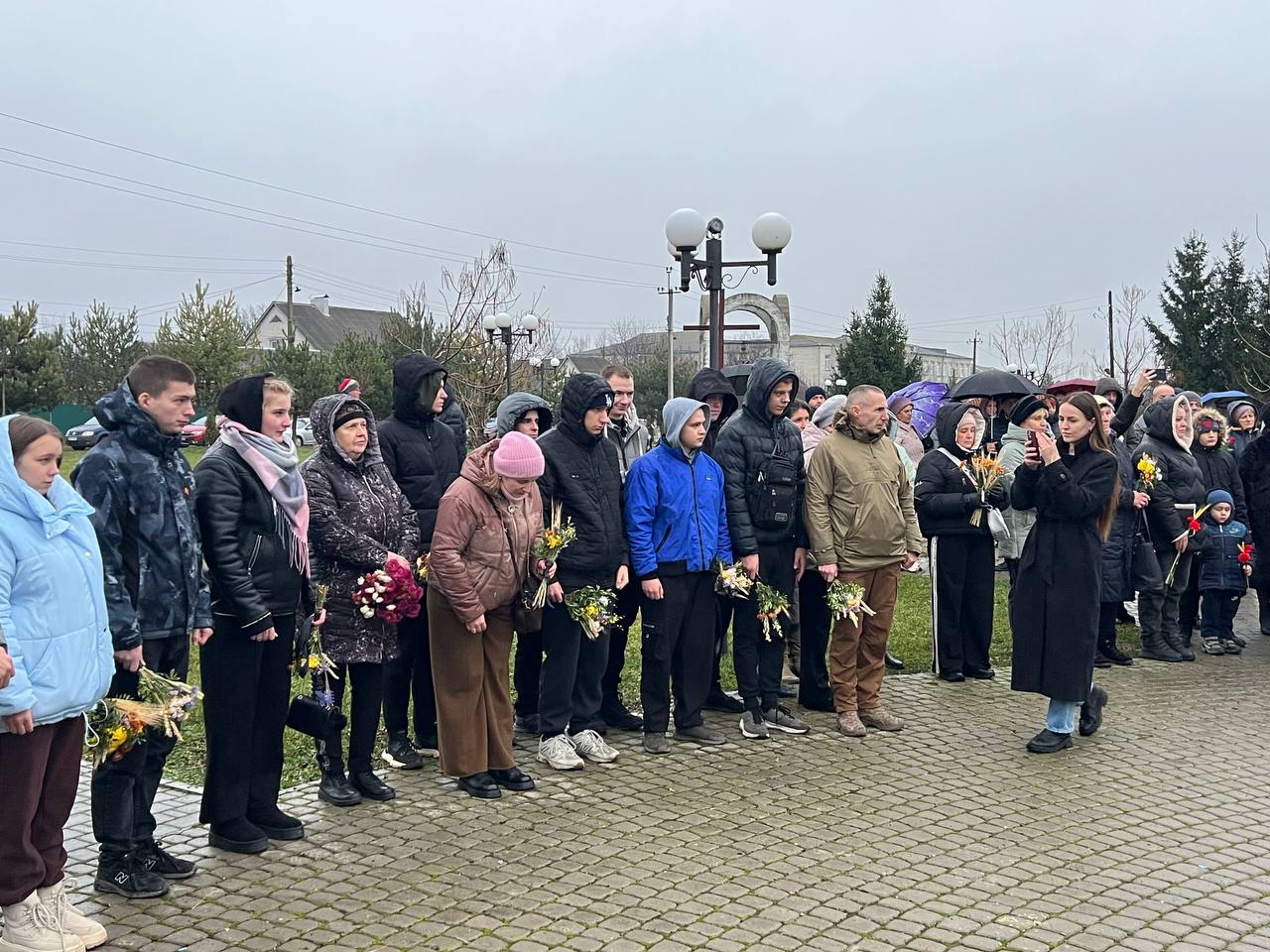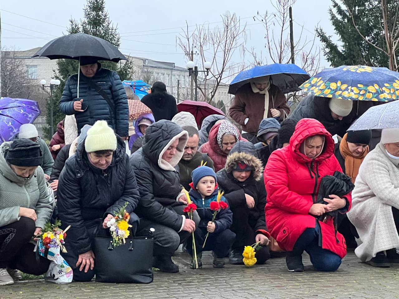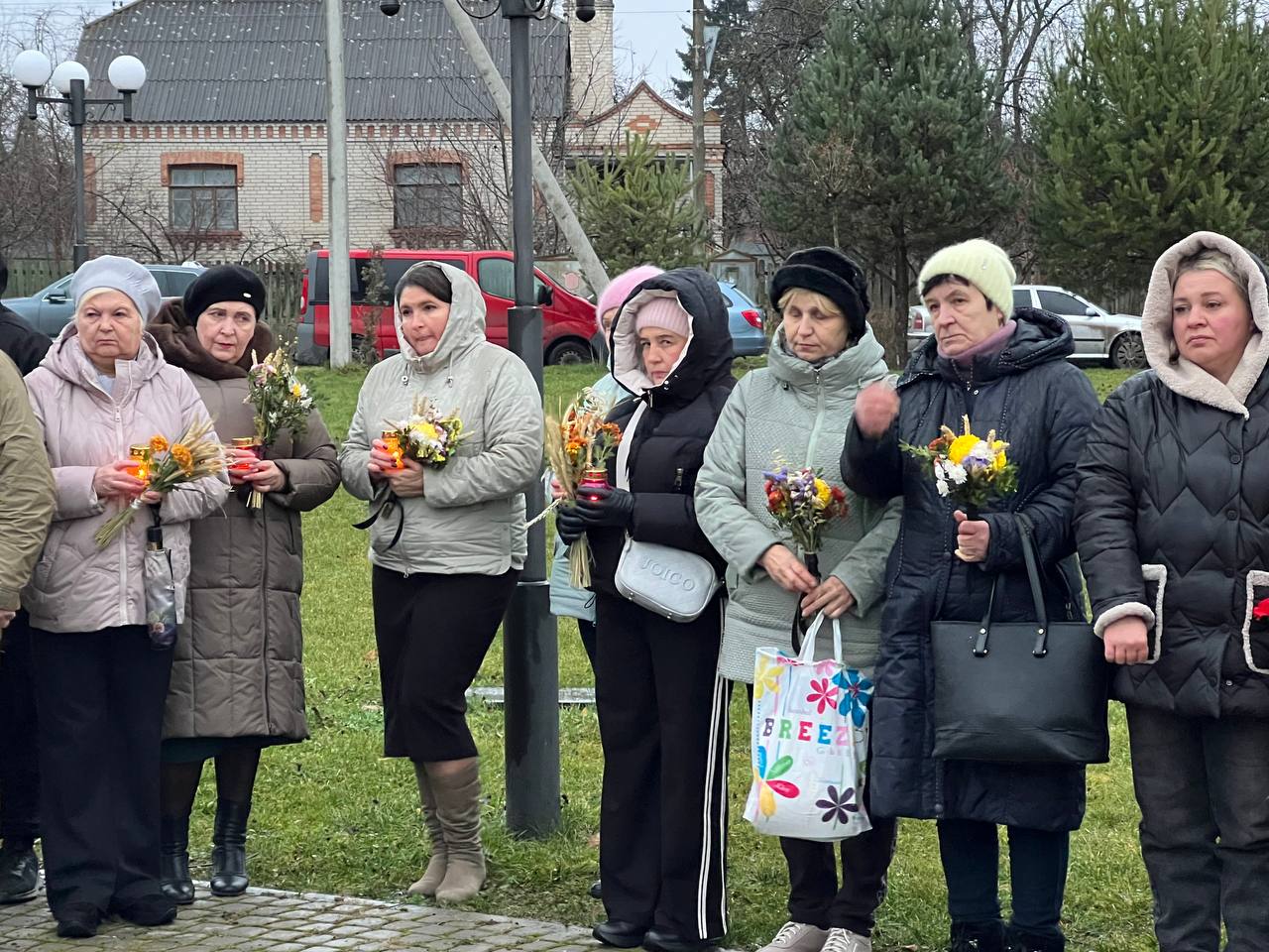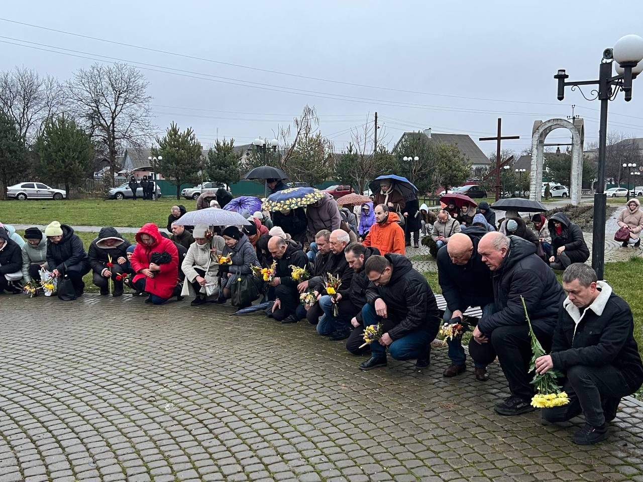 На знак глибокої скорботи та пам'яті про заморених голодом українців хмільничани запалили лампадки та поклали до меморіального хреста букети з колоссям пшениці та живими квітами.