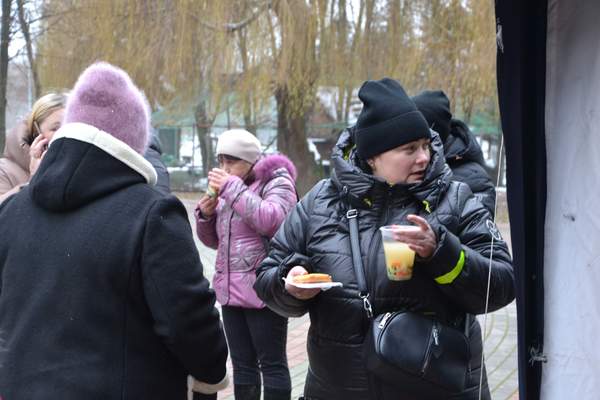 У рамках недільної акції хмільничан частують бутербродами, гарячим чаєм та юшкою, яка не тільки смачна та корисна а й допомагає зігрітися у холодний осінній день.