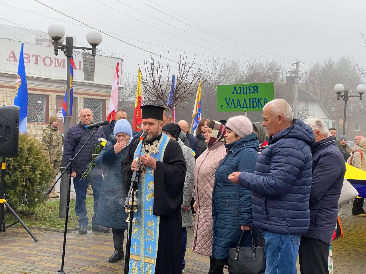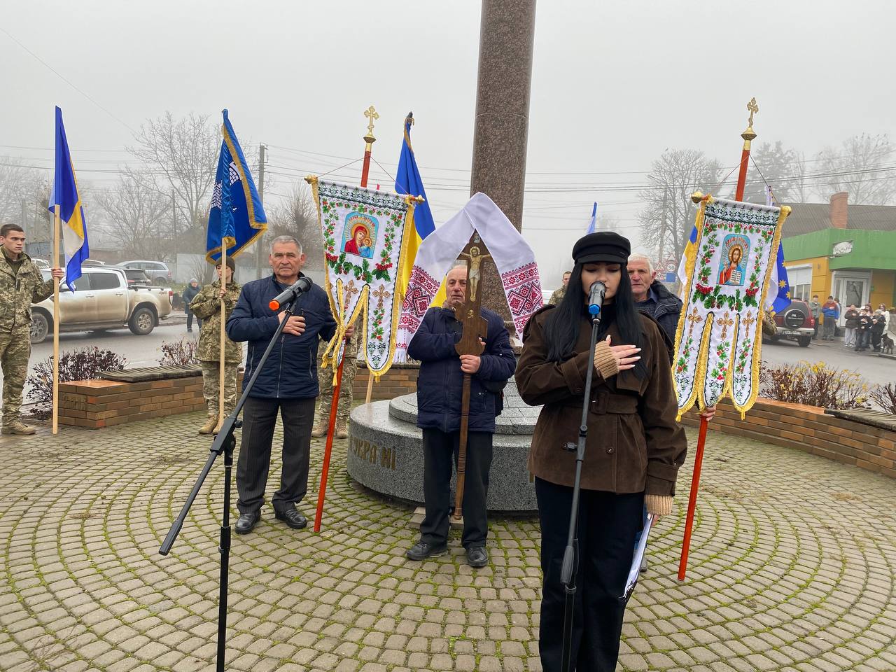 Біля пам’ятного знаку благочинний храмів Хмільницького району протоієрей Іван Пукас разом із присутніми звершив спільну молитву за Україну, її захисників та всіх борців за свободу й незалежність.