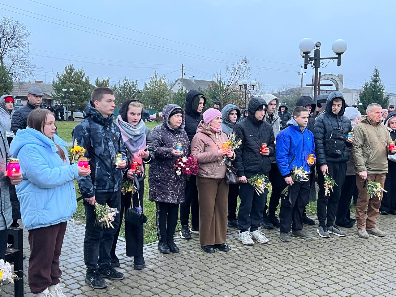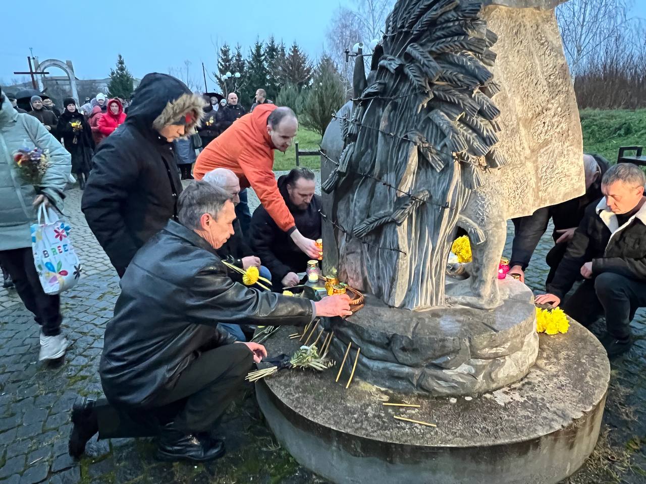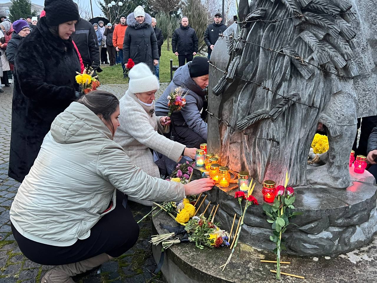 На знак глибокої скорботи та пам'яті про заморених голодом українців хмільничани запалили лампадки та поклали до меморіального хреста букети з колоссям пшениці та живими квітами.