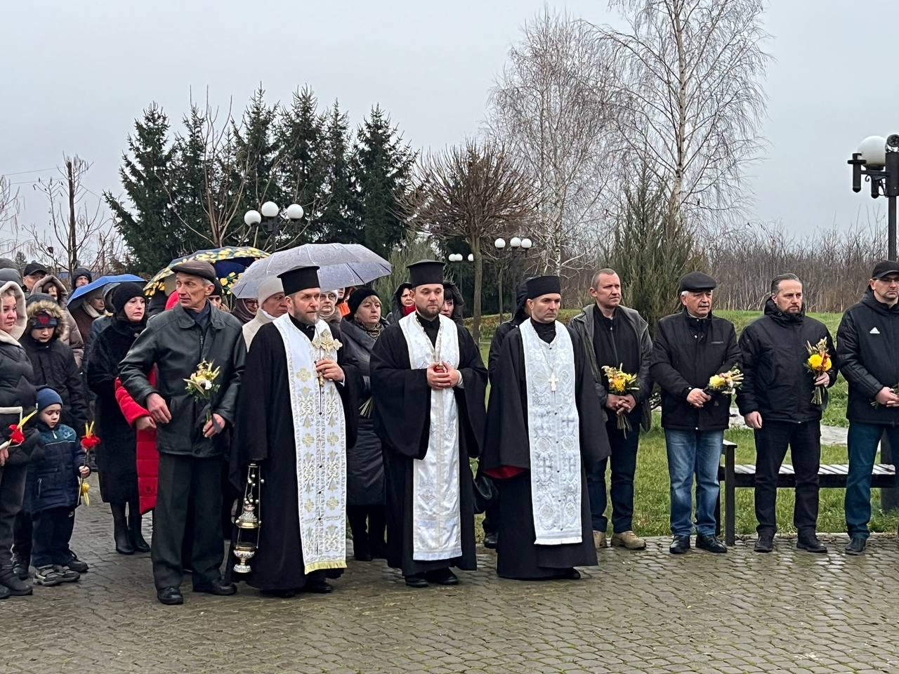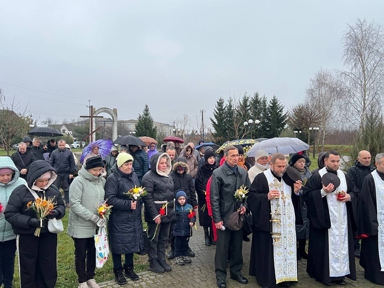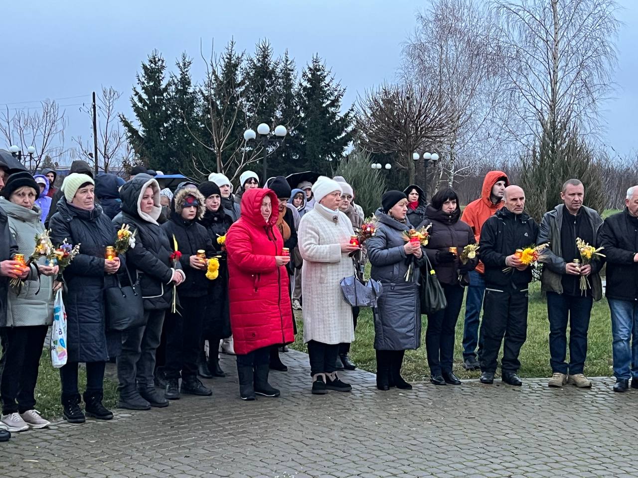 На знак глибокої скорботи та пам'яті про заморених голодом українців хмільничани запалили лампадки та поклали до меморіального хреста букети з колоссям пшениці та живими квітами.