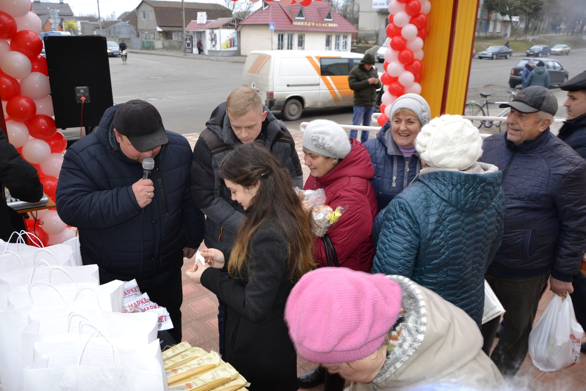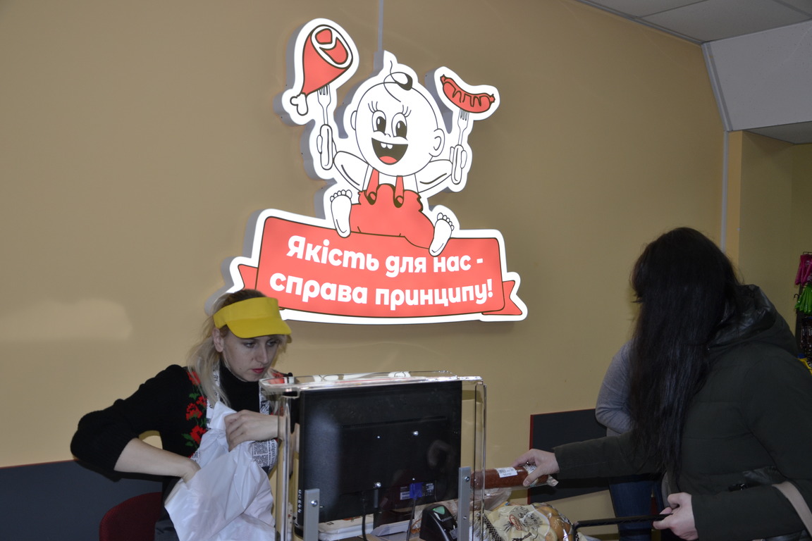 Всередині на відвідувачів чекав величезний асортимент свіжого м’яса, ковбасних, молочних виробів і соусів, спецій та солодких смаколиків. А вийшовши з магазину, кожен покупець із чеком на 300 гривень і вище отримував бонус вручений Олександром Захаровим у додаток до придбаного, а саме: пачку спагеті чи палку ковбаси, або ж цілий подарунковий набір.